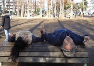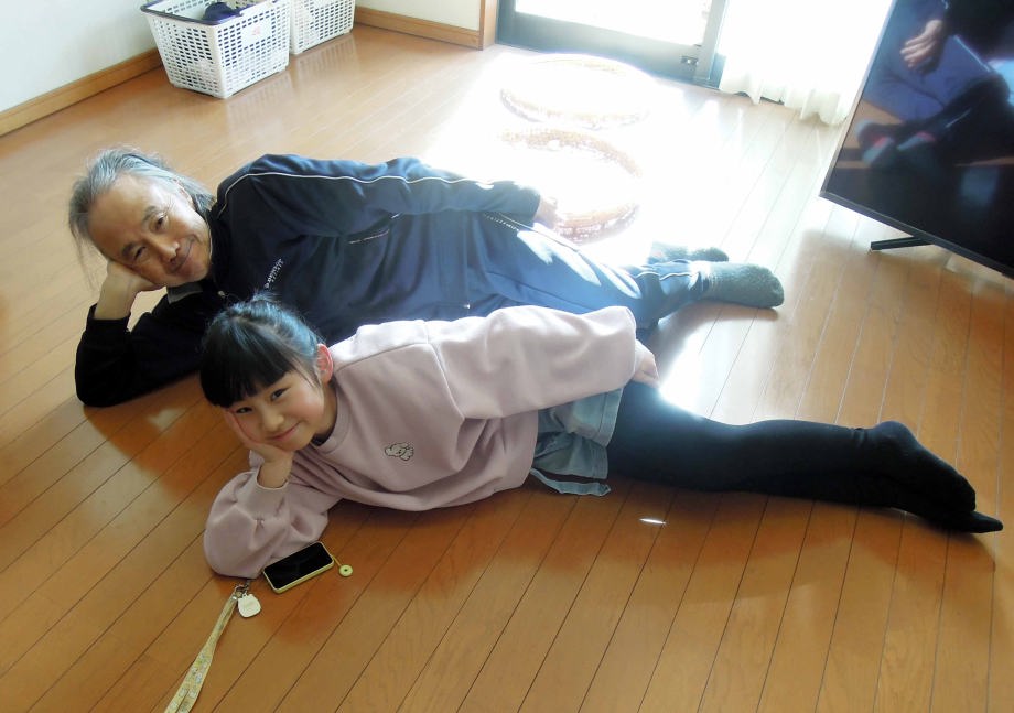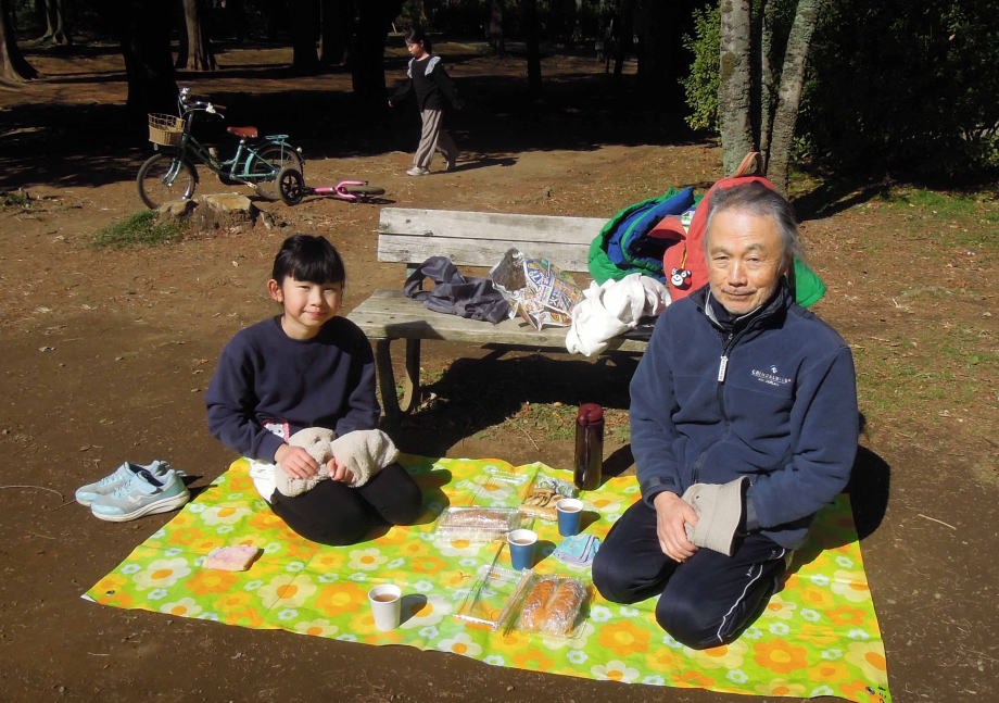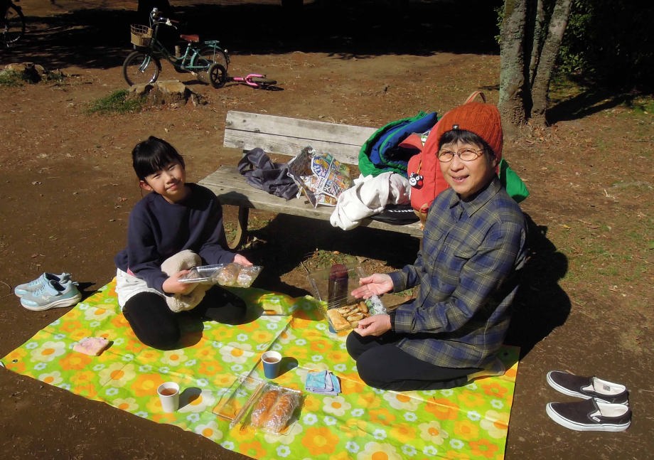 | 背伸ばしベンチに座ったの。爺ちゃんが落ちない様に手を繋いだの。 |