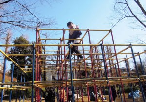 | ジャングルジムに上ったの。兄ちゃんはジャングルジムが大好きなんだって。 |