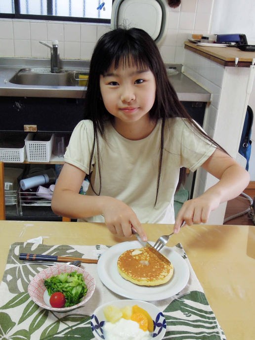 朝ごはんのホットケーキよ。ナイフとフォークで食べたの。