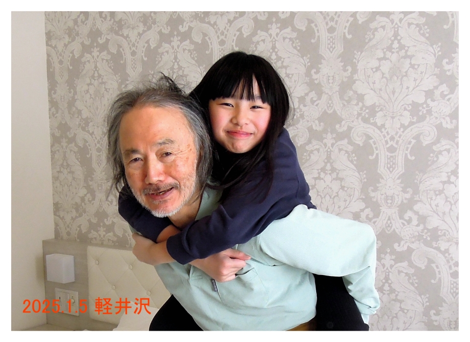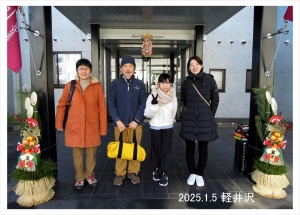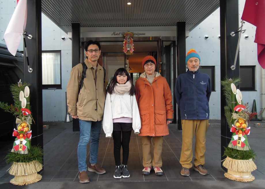 | パパは仕事が忙しいから、四時半に帰ったの。ホテルの玄関で記念撮影したわ。 |